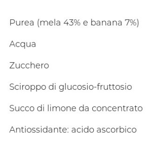 acqua, purea di mela 43% banana 7%, zucchero, sciroppo di glucosio fruttosio, antiossidante: acido ascorbico.