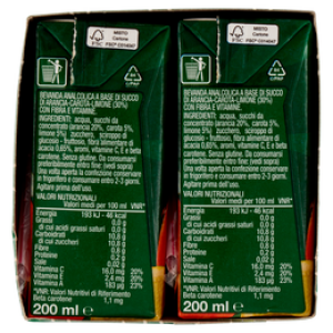 • Acqua, Succhi da concentrato (arancia 20%, carota 5%, limone 5%), Zucchero, Sciroppo di glucosio-fruttosio, Fibra alimentare di acacia 0,65%, Aromi, Vitamine C, E e beta carotene, Senza glutine